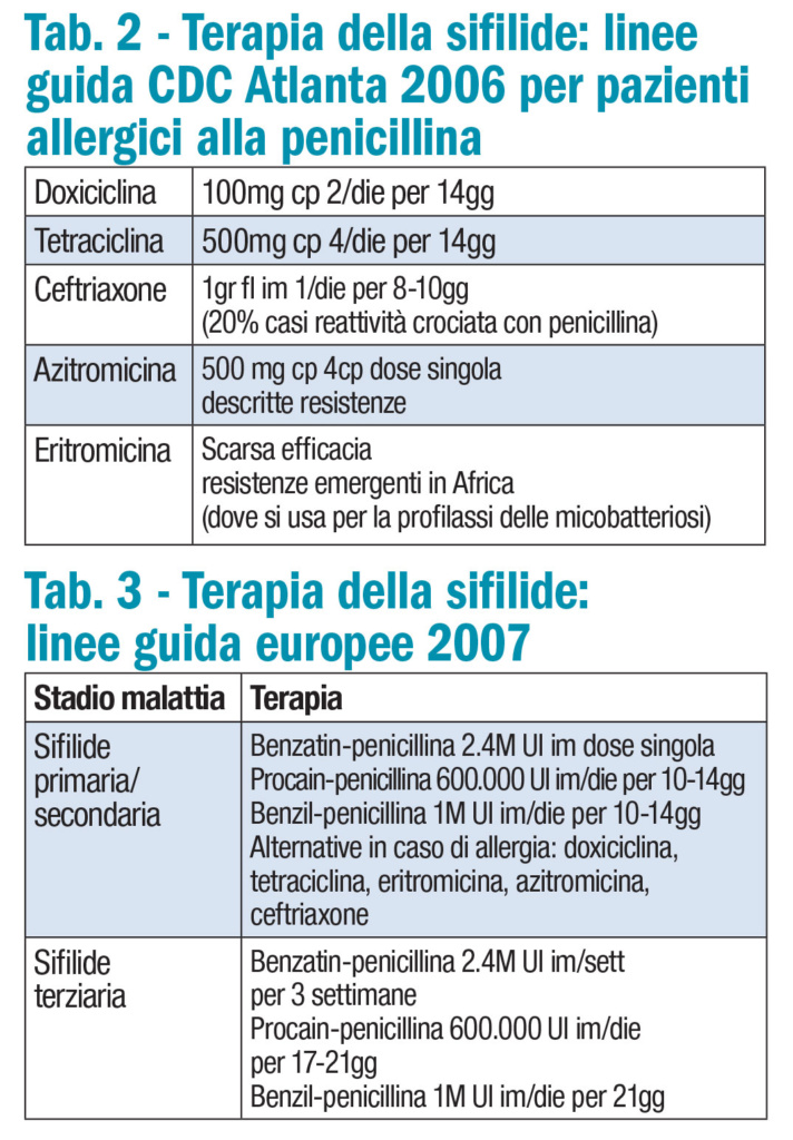 La terapia della sifilide può essere riassunta in una parola: penicillina, scoperta nel 1928 e usata per la prima volta per trattare la sifilide nel 1945. A oggi non ci sono segni di resistenza di T. pallidum alla penicillina. Per trattare la sifilide ci si basa sull’assorbimento delle diverse penicilline e sulla loro capacità di superare placenta e barriera ematoencefalica. La penicillina G può essere impiegata nella sua forma cristallina acquosa per via endovenosa, come penicillina procaina acquosa per via intramuscolare o come penicillina G benzatina come iniezione a lento rilascio intramuscolare.